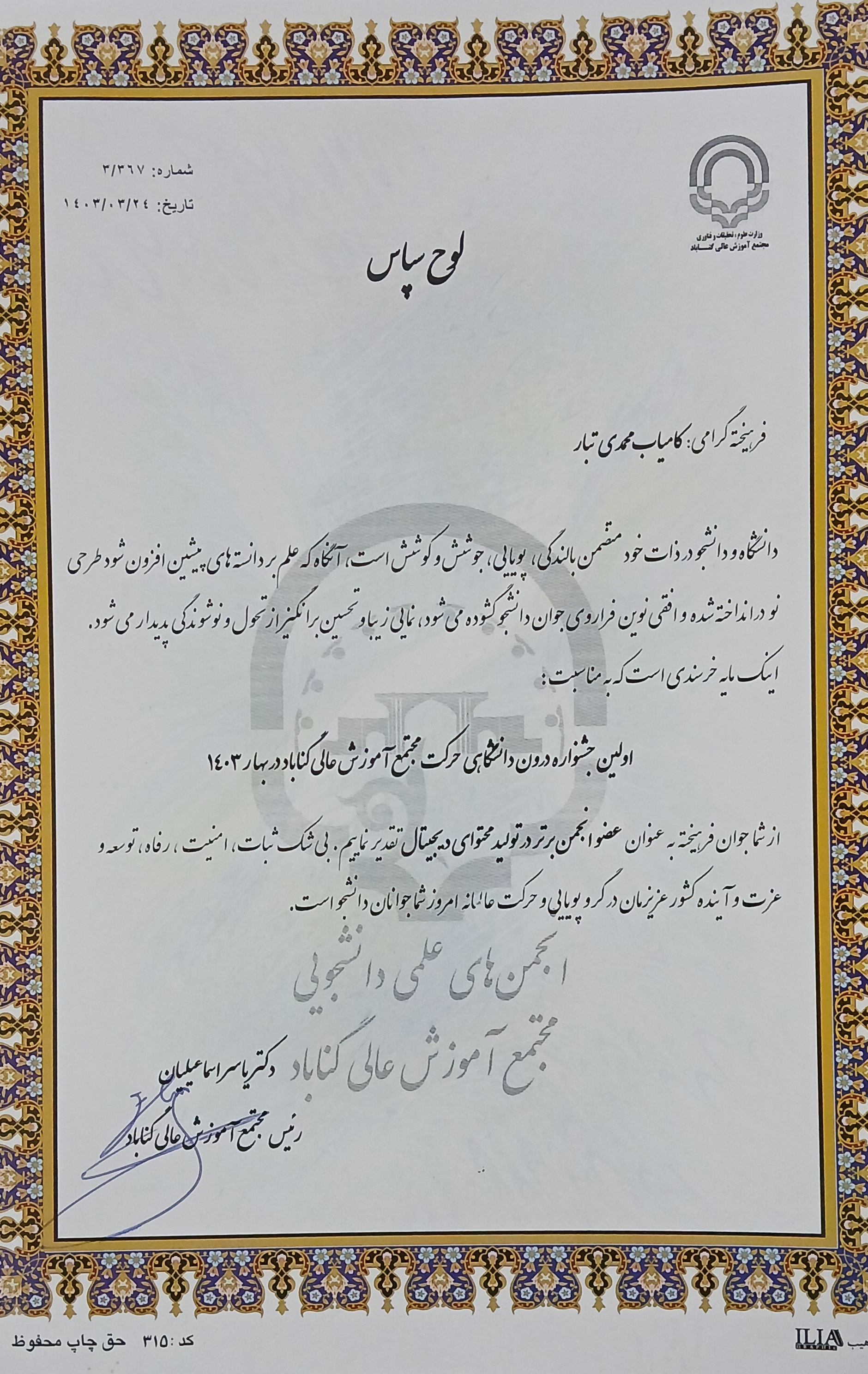 Main Member of the Central Council of the Computer Engineering Scientific Association, Gonabad University